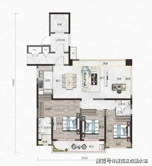 点评:该户型位于7号楼边户,户型方正,三开间朝南,南北通透,动静分区较好。