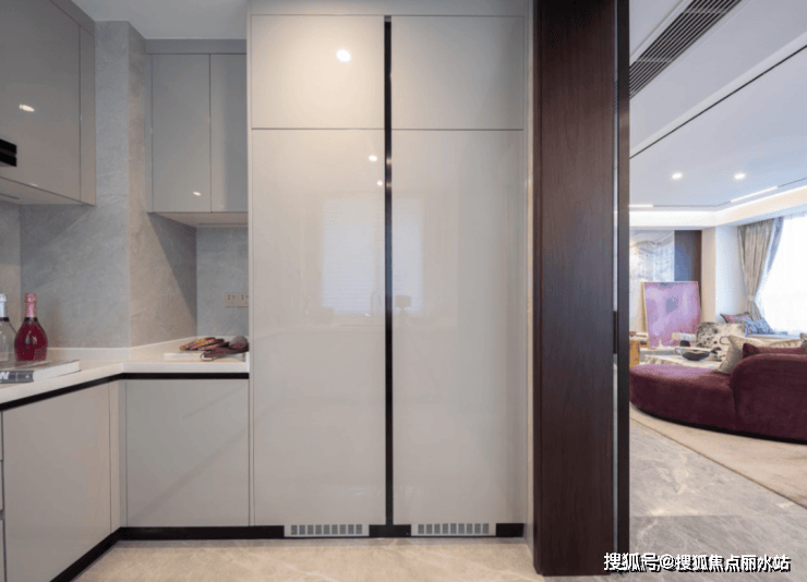 另外,在大量研究人们烹饪习惯的基础上,我们还将厨房分为 收纳、储藏、预制、操作四大区域,天使拉篮、分类储物橱柜设计 ,并运用U型布局,让业主们能更轻松地烹饪美食。同时用R型挡水条、厨房移门使用上轨道设计等等细节,来方便居者日常的打扫。
