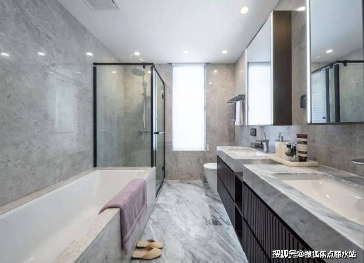 首先,澜园在装修材质的选择上,大面积运用高级灰色系石材,因其三面采光的户型格局,整体通透敞亮,所以即便采用现代灰色调,也丝毫不显暗沉,更突出沉稳大气的审美基调。