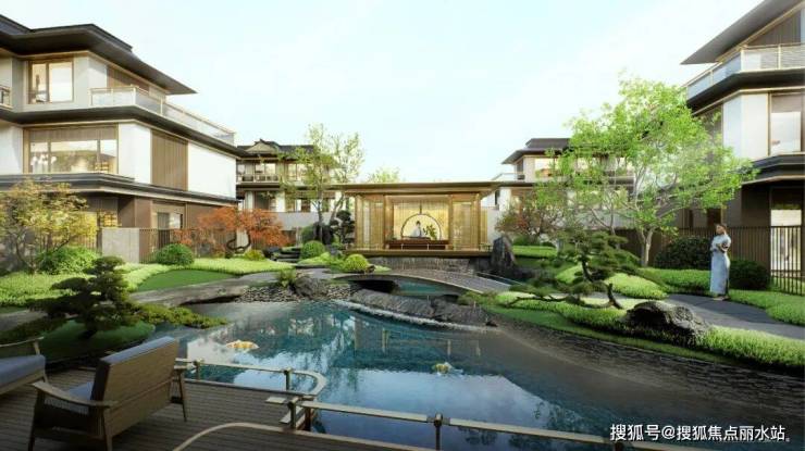 在建筑园林打造上,延续“山河”系列一脉相承的宋式美学基因,萃取《营造法式》中经典建筑语汇,以“落客、登门、入境、入画、人心”五进礼序空间,层层递进,演绎归家仪式感。同时遵循宋代园林“堆山、叠石、理水”的造园古法,将建筑轮廓、错落灌木、蜿蜒小桥与灵动流水相融,构建高、中、低三重立体景深层次。日常动线仿若穿行于流动的宋风长卷,意境悠远,心归画中。