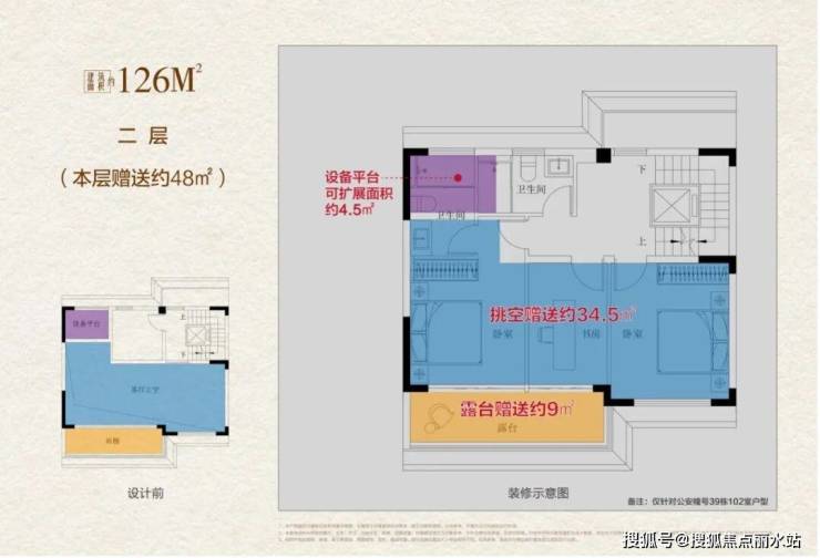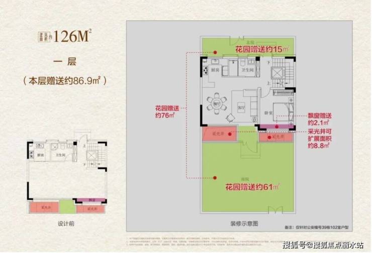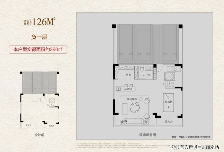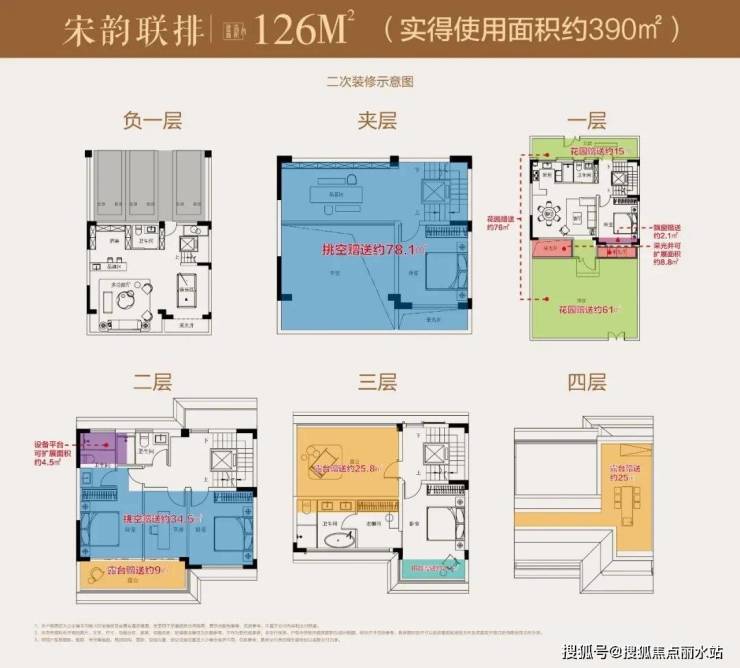 改善进阶:一样的面积,不一样的生活质感,以项目主推的126㎡超级联排别墅为例,通过产品革新营造的极致得房率,实现买126㎡得390㎡的高附赠空间拓展,享受有天有地纯粹墅居生活,满足“居住+社交”双重需求。