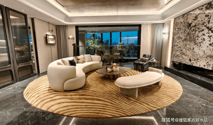 艺术入户大堂以光影与线条勾勒礼序,城市喧嚣被悄然隔绝,取而代之的是湖山生活的雅致氛围;