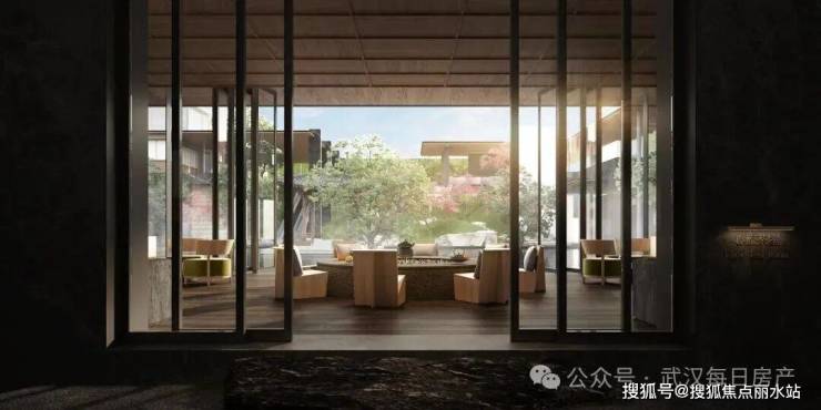 【心流盒子】:整个茶室空间由木材质进行包裹,天花木格栅造型延伸至墙面,打造出立于庭院旁的独特“木质盒子”。推开茶室折叠门,中心庭院的景观一览无余,示范区旖旎风光亦能尽收眼底。