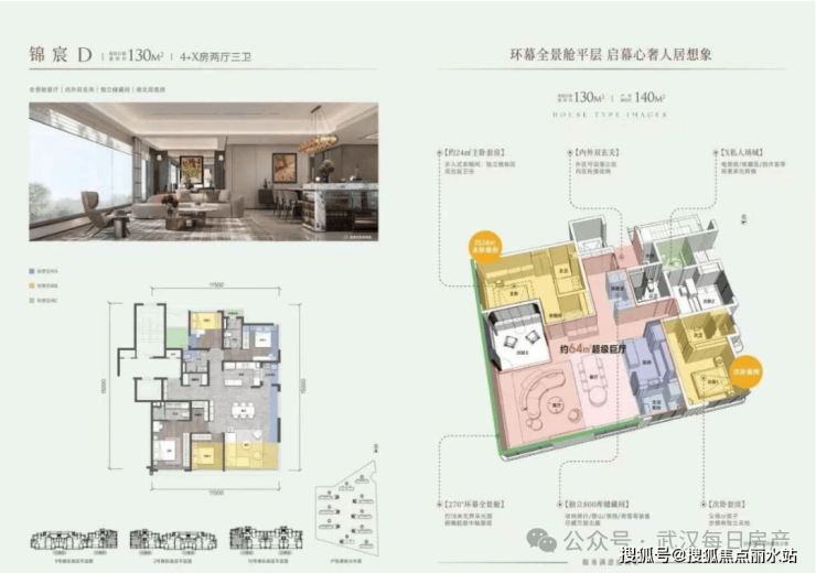 此户型分布在2/3/4/7/8/9/10号楼7-11层小高层一梯两户布局,与135㎡户型一致分布在小区景观主轴上;宽(开间)约11.5米,深(进深)约15米;拥有转角玄观设计、预留有储物间,三开间朝南、270°客厅视野采光极佳,双套房设计,主卧套间约24㎡;(主卧卫生间非明卫,无窗户)