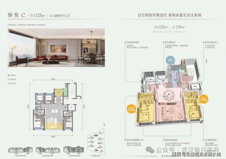 135㎡四房两厅三卫(规划计容面积约125㎡--锦悅):此户型分布在6/10号楼、2/3/4/7/8/9号楼11层小高层,一梯两户布局;宽(开间)约12.5米,深(进深)约14.75米;三开间朝南、厨房链接生活阳台,双套房设计,主卧套间约20㎡、次卧套间约16㎡;(次卧卫生间非明卫,无窗户)
