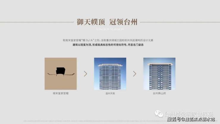 汲取宋朝官帽之形,独创“官帽式大挑檐”设计,幢幢带夜景灯带冠顶