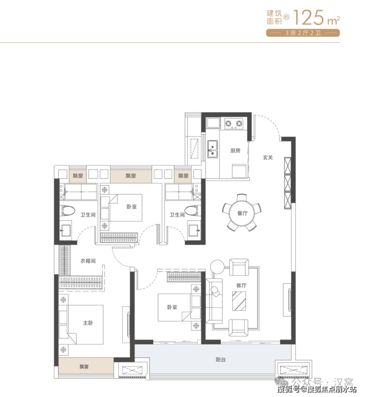一体化餐客厅连接5.5米宽阳台,力求空间开阔,主卧为套房设计,自带独立卫浴。