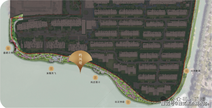 凤起潮鸣更凭借其三面环水的天然禀赋,将红线外约750米滨湖岸线纳入整体规划,打造约460米鸣凤堤,重现“舟行碧波上,人在画中游”的诗意栖居。