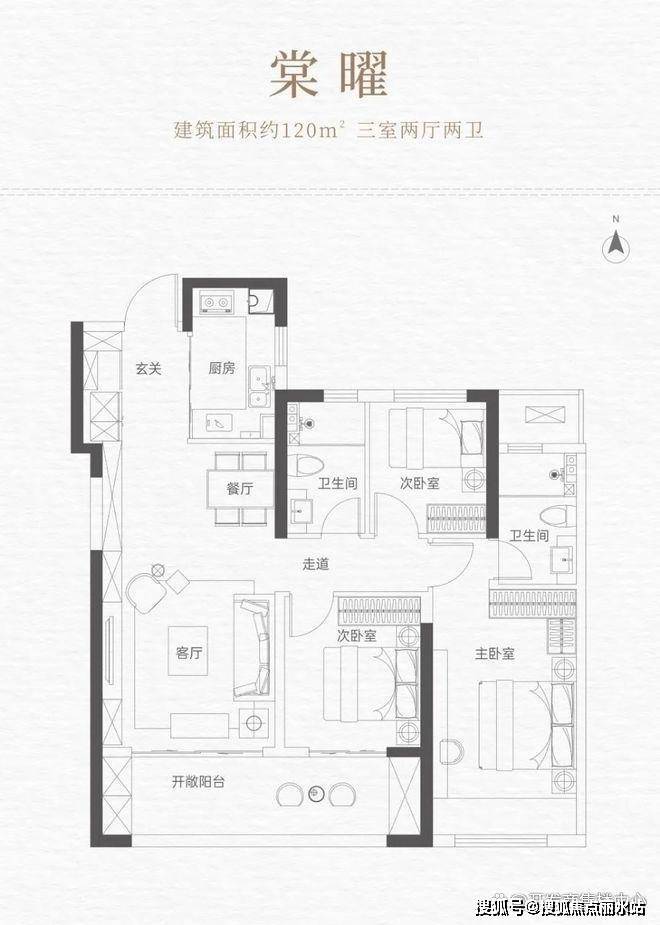 建面约120㎡的经典三房户型,做到了标准的三开间朝南,整个布局动静分区,户型全明,两个卫生间也是亮点之一。