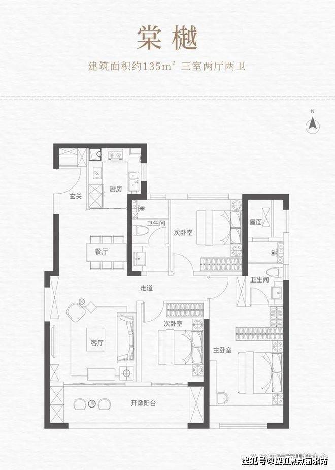 建面约135㎡的大三房,可以理解为120㎡的放大版,增加了独立玄关,IMAX级观景阳台,同时为家庭结构预留弹性改造的空间。
