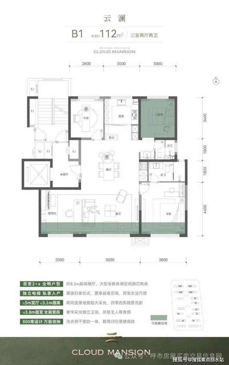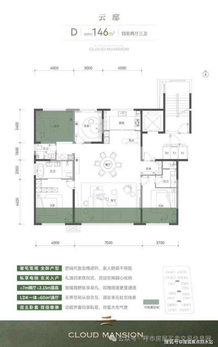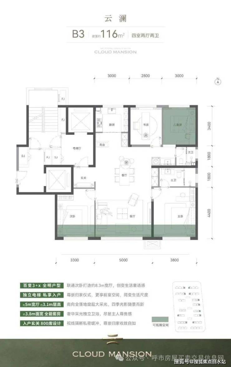 全17层均质低密小高,全产品全部实现一梯一户,奢享电梯前室。更以生长式、可扩变的空间、尺度、格局,立序青城标准。全系南向全景落地窗,层高约3.1m起。南向三开间,同等类型面宽(主卧、次卧、客厅)皆最大,三居户型约4m客厅,可改造为约7m宽厅。四居户型约5-7m宽厅,可改造为约8-10m+大横厅,居住舒适度大幅升维。