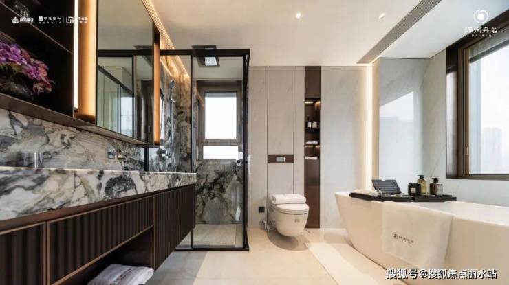 主卫配置 当代 龙头花洒及 劳芬 智能马桶 (或同等档次) , 杜拉维特 人造石材独立浴缸 (或同等档次) 。