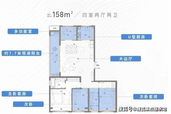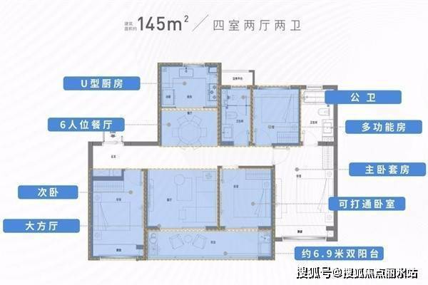 2、大尺度LDKB,居然无过道浪费:公区LDKB一体化设计,室内形成多重洄游动线,没有一点过道浪费,套内利用率令人震惊!40多㎡的大边厅,社交特征十分突出。U型厨房,配备了北侧开窗,更具通透感。独立玄关入户,转身就能进入厨房,再到餐厅用餐,然后一家人围坐在客厅聊天,或是在大阳台喝茶。