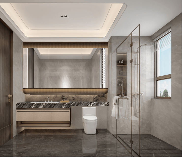 卫浴里的面盆、龙头和恒温花洒都是科勒,大户型主卫还配置了美妆冰箱和科勒智能马桶。