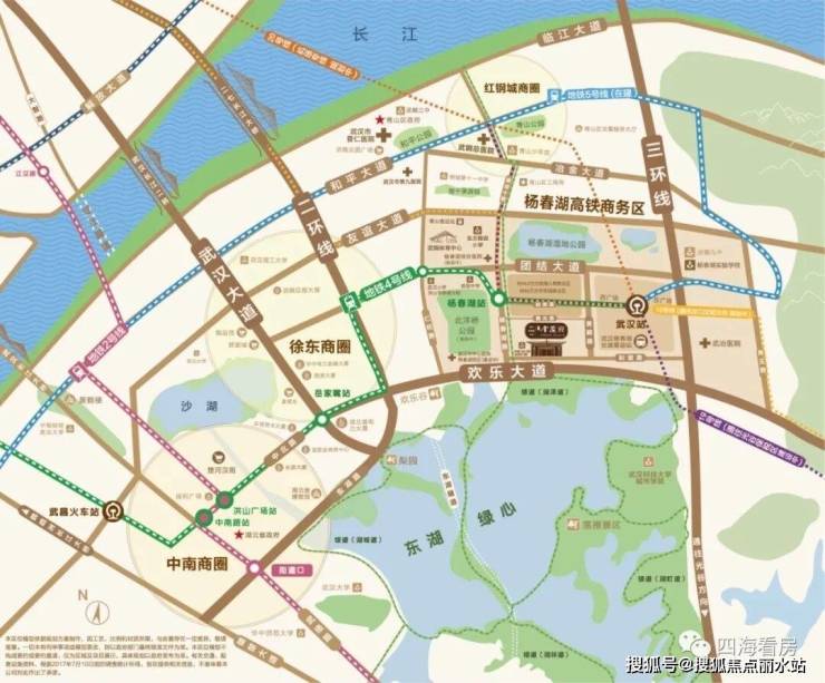 东湖金茂府位于杨春湖路以东,和谐路以北,武汉火车站以西,大区位上属于杨春湖高铁商务区,行政划分属于洪山区,距离二环线4.2公里,属于三环内。