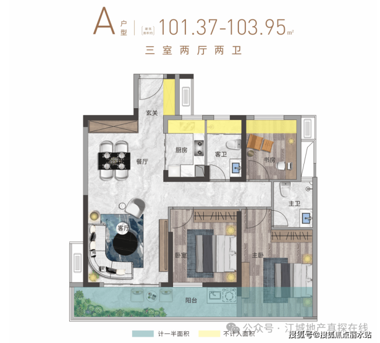 比如说这款户型,建面约101.37-103.95㎡,三房两厅两卫。