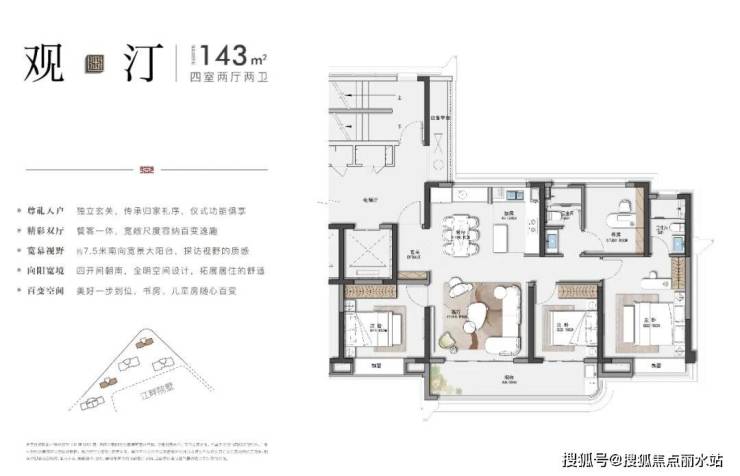 以建面约143㎡【观汀】的户型为例,方正户型上减少了大面积浪费,主卧、两个次卧、客厅四开间朝南,餐客一体直连约7.5m大阳台,主卧与一个次卧向南赠送飘窗,另一个次卧连接阳台,尽情享受阳光生活。