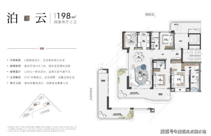 以御境双江建面约198㎡四室两厅三卫产品【泊云】为例,270°半包围式的超大空中花园配合约16.7m南向开间,客厅、主卧、次卧全明采光,主卧双衣帽间的设计,同时满足男女主人的储物需求。四室的配置,将义乌人三代同堂的理想带入现代高层。