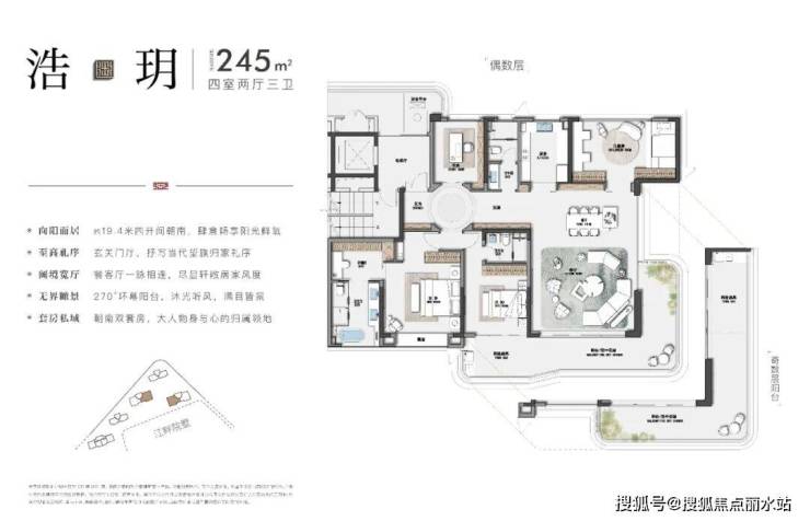 而建面约245㎡的【浩玥】户型,也是同样四室两厅三卫的配置,可以说是198㎡户型的“PLUS”版,进一步上升了生活尺度——约19.4m四开间朝南的设计,自然阳光入室,为空中花园的景观打造提供更大的想象空间。