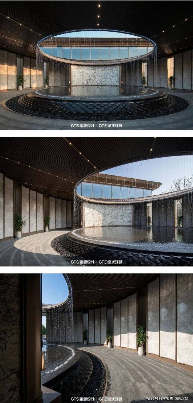 入口门头隐于自然之后,在传统礼序的基础上,融入了酒店式落客理念。弧形入口连接延伸落客平台,叠水景观拾级而上,华灯初上,四时皆景伴水归家。