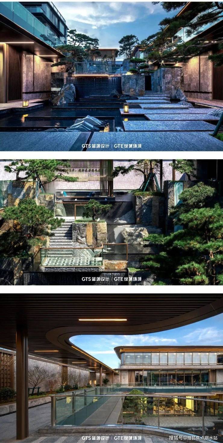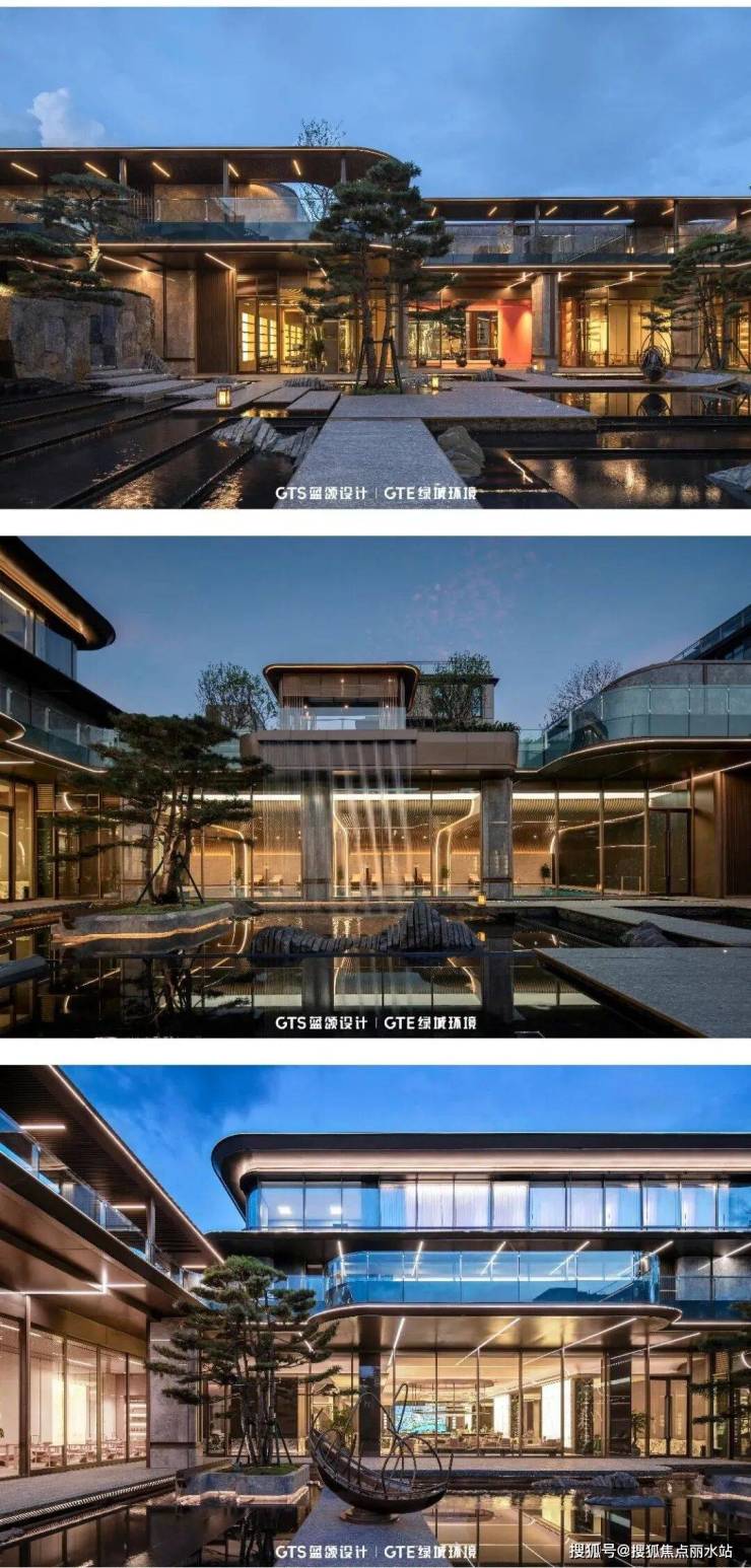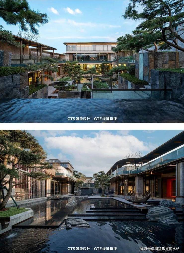 层叠水景托举折桥园路,松壑悬亭,石材点缀于水院中,雕琢出层层山峦肌理。室内与景观相互渗透,流光溢彩演绎当代宋韵山水的宁静与浪漫。