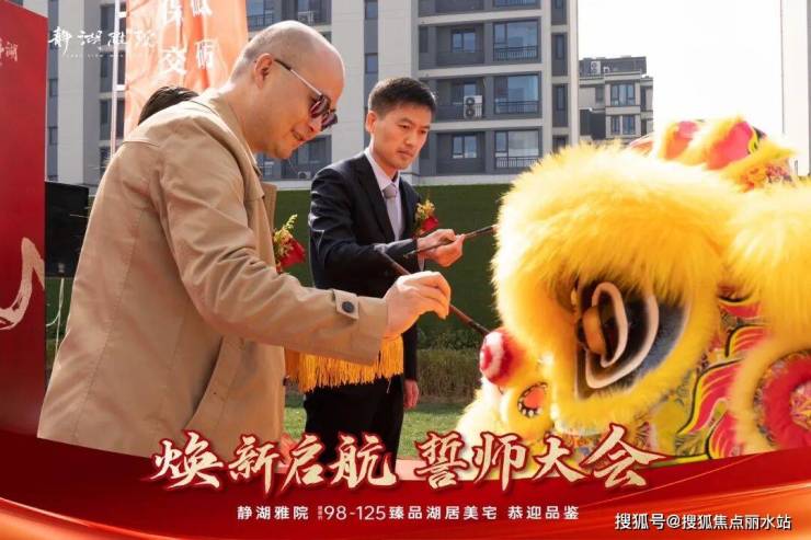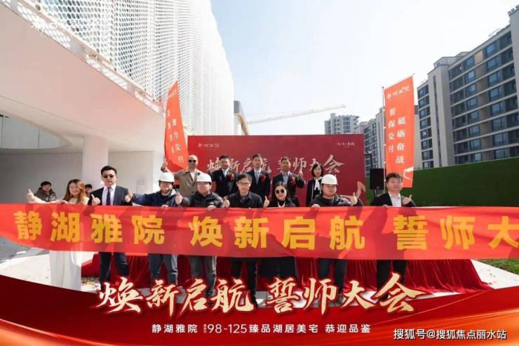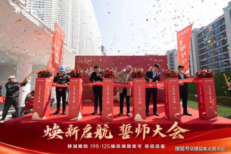 在本次静湖雅院焕新启航誓师大会活动上,各单位领导共同为项目开放仪式进行剪彩,总包单位上台宣誓,宣告静湖雅院项目正式入市,启幕苏州下一个湖居时代。