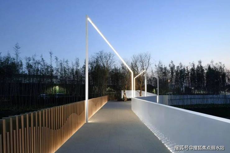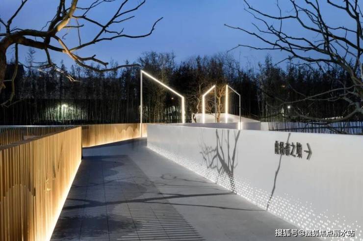 水面串联起光之谷、廊道、平台、建筑,微风拂过,水面泛起层层涟漪,憩于平台之上,观疏影横斜,竟有些分不清现实与虚幻的界限。朴树多姿,休闲安逸,静待人至。