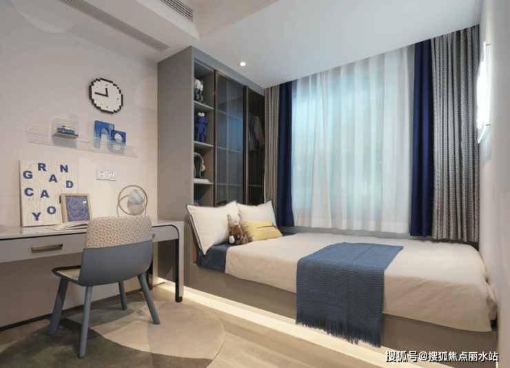 男孩房利用飘窗打造出榻榻米空间,与衣柜融为一体。