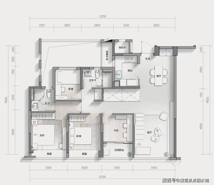 整个客餐厅部分几乎小一半的面积,都是半赠送,阳台、飘窗、设备平台也进一步拓展了使用面积。