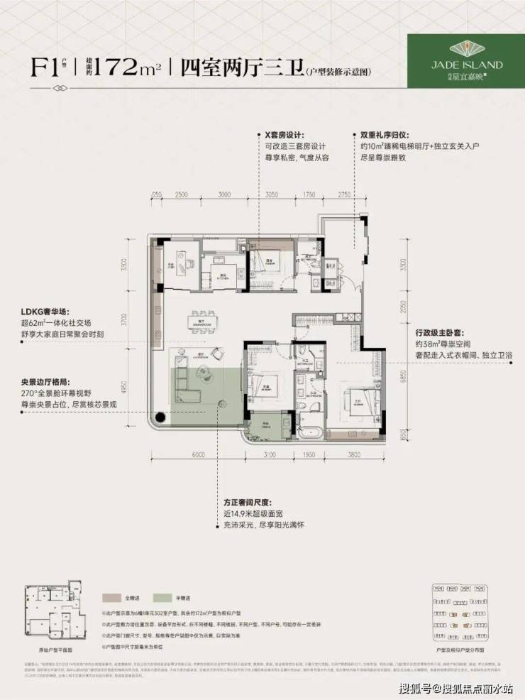 172㎡边厅户型,含赠得房率96%,赠送面积超过20㎡。