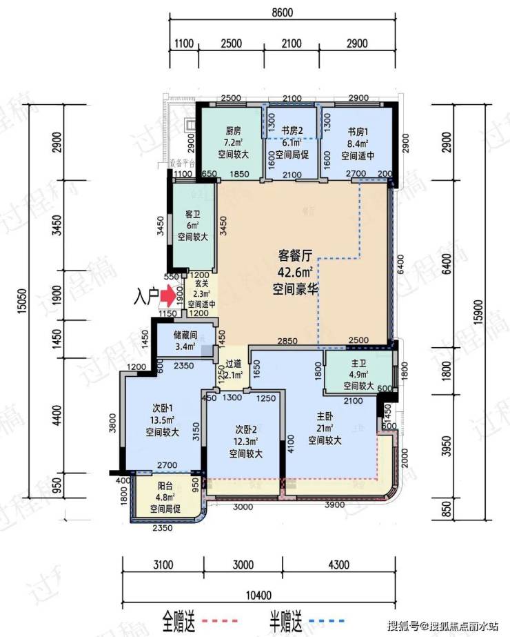 南向次卧外的阳台,以及餐客厅中的将近10㎡,都是半赠送空间。