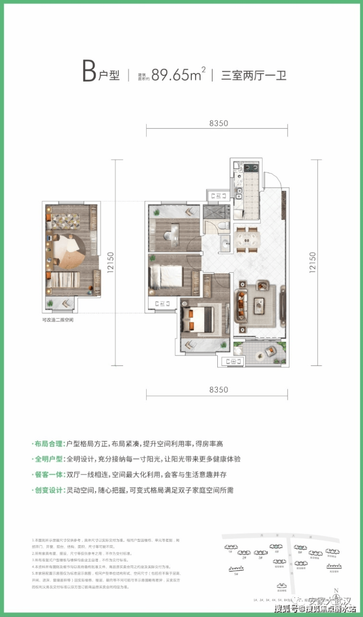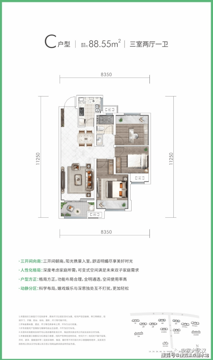 在售户型:88、89㎡三房两厅一卫