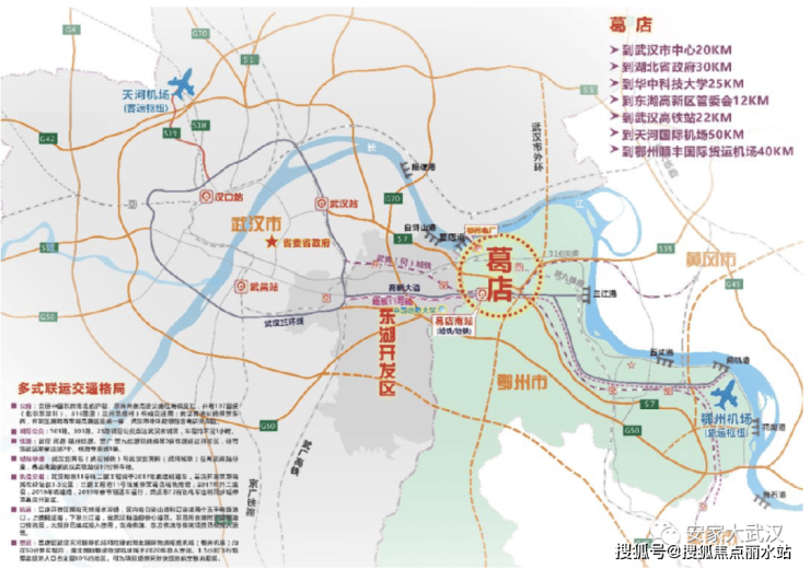 葛店距离正在建设的湖北国际物流核心枢纽机场--鄂州顺丰机场约35公里,距离武汉天河国际机场约50公里。