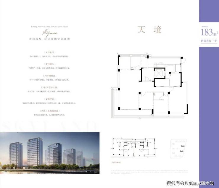 更让人惊喜的是,该项目还结合部分楼栋自身的观景优势,打造创新性大平层产品。比如,沿河建面约183方大平层充分利用场地优势,打造崭新的边厅户型、L型跑道阳台,以及全景落地玻璃。