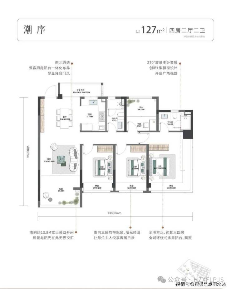 揽景小高层建筑面积约105-130㎡,为最大化景观面,突破性设计建筑面积约105㎡南向四开间。