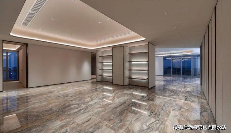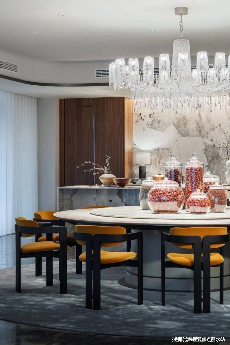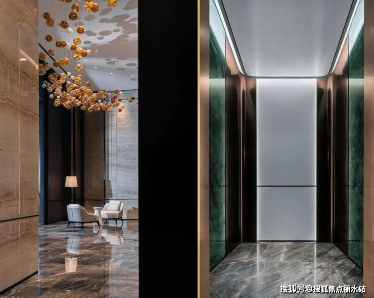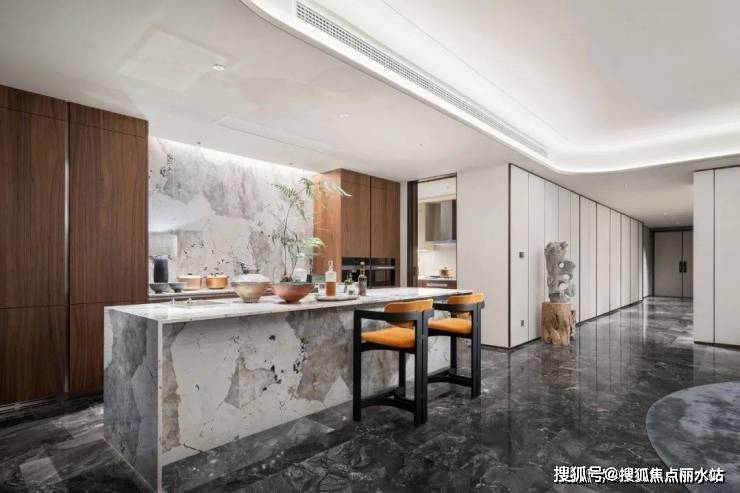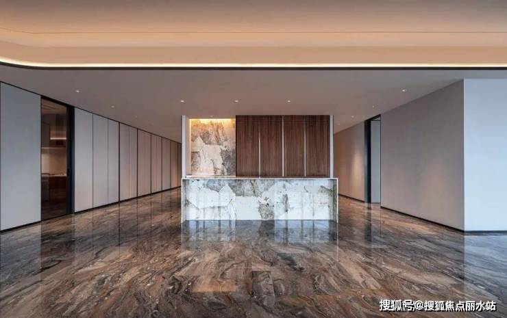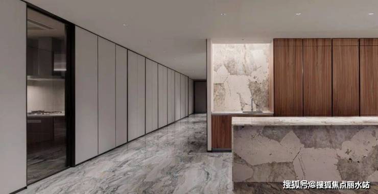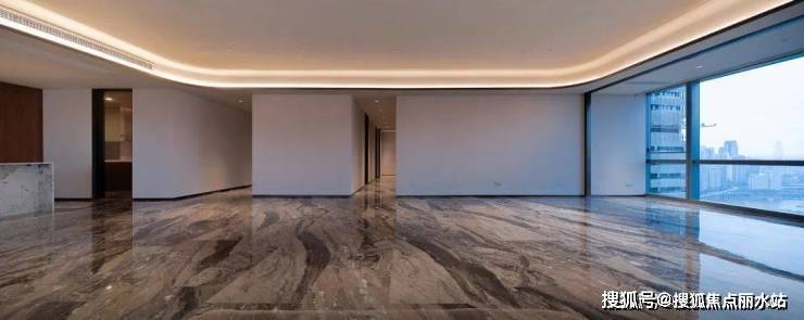 于是他在用材用色上低调、沉着,大多取自天然,又用满铺的威尼斯棕大理石(大户型交标)与琉璃山水相互映照。