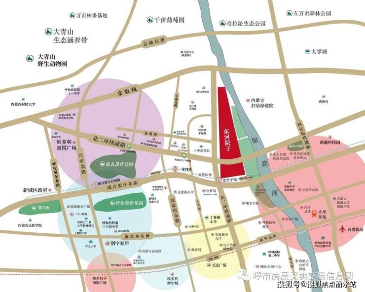 项目位于两大城市主城区-新城区与如意区的黄金交界处,众所周知,如意区是呼和浩特市有名的“富人区”,区域内高端小区林立,成就了如意区浓郁的居住氛围。同时,如意区也是呼和浩特市市政与内蒙古自治区大力发展打造的金融、商务、政务中心,是内蒙古乃至整个西部的CBD区域。东河院子坐享两大主城区的资源优势,不仅坐享政务、商务、金融的良好发展前景,同时还为居者的生活、居住提供了便利。