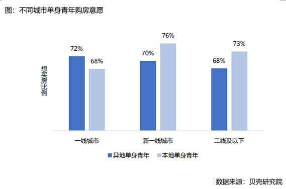 “5·20”到来,单身青年们的消费观在这个爱情节日的映衬下,反而更为凸显。随着单身社会崛起,“一人食式”消费走俏,反映到购房消费领域又是怎样的呢?5月19日,贝壳研究院发布的《单身青年安家置业调研报告》(简称“《报告》”,调研人群为18-36岁)显示,超70%的单身青年有购房打算,其中新一线城市的本地单身青年置业愿望较高,占比达到76%。