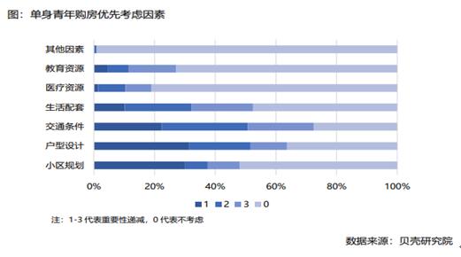 值得注意的是,单身青年相对来说更偏爱新房、小户型。调研显示,仅14.68%的单身青年倾向二手房,占比明显低于恋爱中或已婚状态的21.6%和20.19%。购房理想面积80平方米以下的单身青年占比28.96%,超过已婚青年群体占比。此外,单身青年较为看重房屋周边交通条件、户型设计、生活配套及小区规划,而教育、医疗资源对购房意愿的影响相对较小。