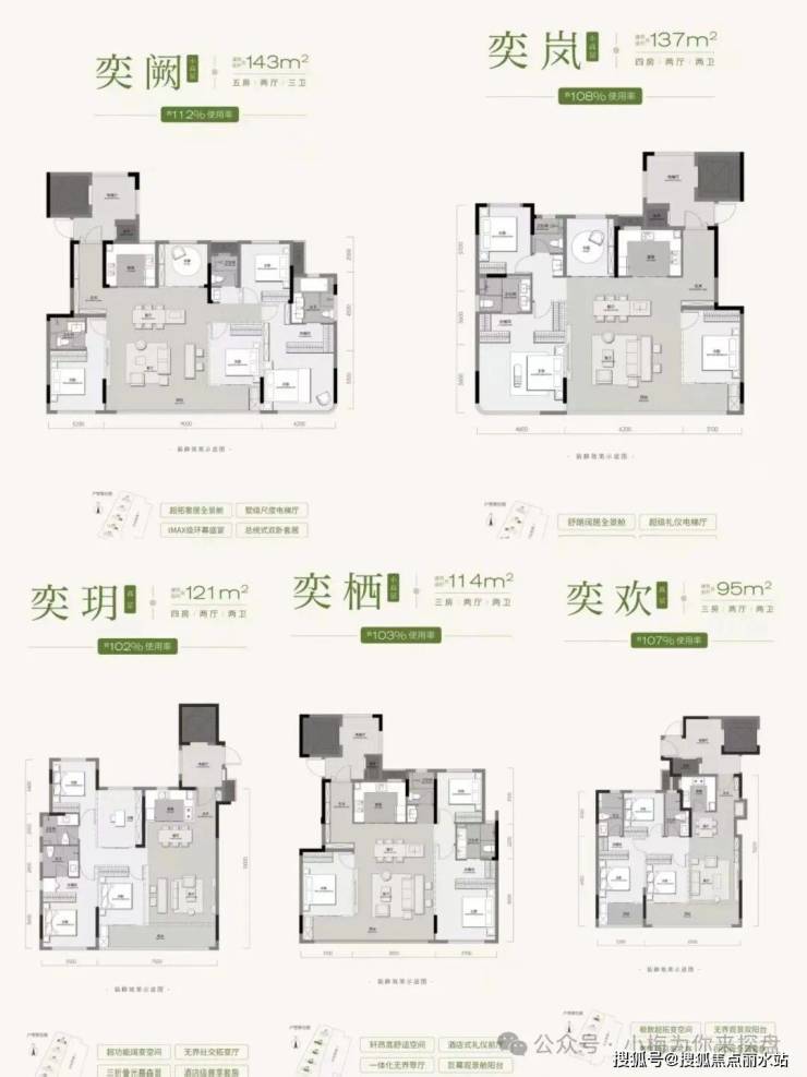 天创-云和奕项目分两期开发,其中一期:5栋11-26层住宅,335户,户均建面116平。一期1#1个单元26层,2、3、4#二个单元都是17层,5#二个单元11层 。都是第四代住宅设计,容积率低,最高得房率约112%,全2T2户配置专梯入户。95-143的面积段都有户型图如下