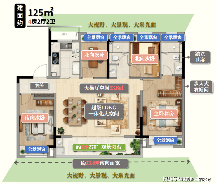 整个户型采用了豪宅圈流行的LDKG设计+阳台大转角270°采光+6个大飘窗+全屋无走廊布局,约13.4米南面宽、以更大的开间尺度,营造开阔轻盈的空间感。