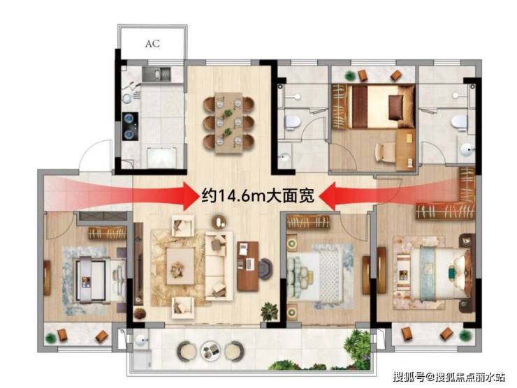 建面约140㎡户型是建面约125㎡的升级版,四开间超大南面宽达到约14.6米,客厅与卧室双联阳台设计达到约8.1米,体验感更显阔绰。