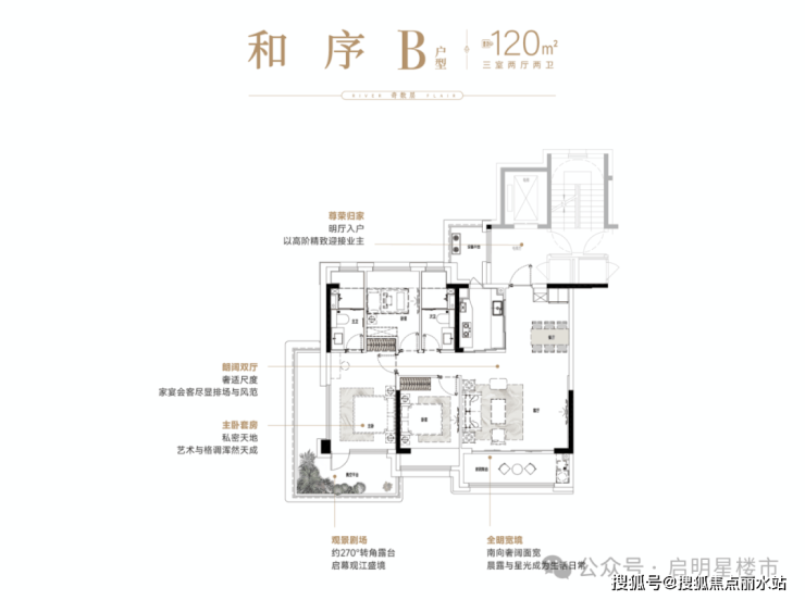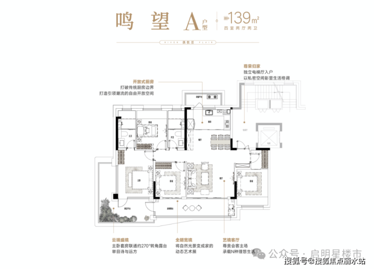 南向主卧星级套房,主卧双面采光与270°露台无界相连;