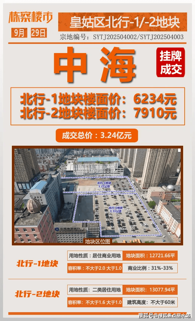 咱先把时间线捋清楚,今年8月28日,沈阳自然资源局挂出北行-1和北行-2两宗地块,9月29日中海就以3.24亿拿下,起始楼面价分别是6234元/㎡(北行-1)和7910元/㎡(北行-2)。
