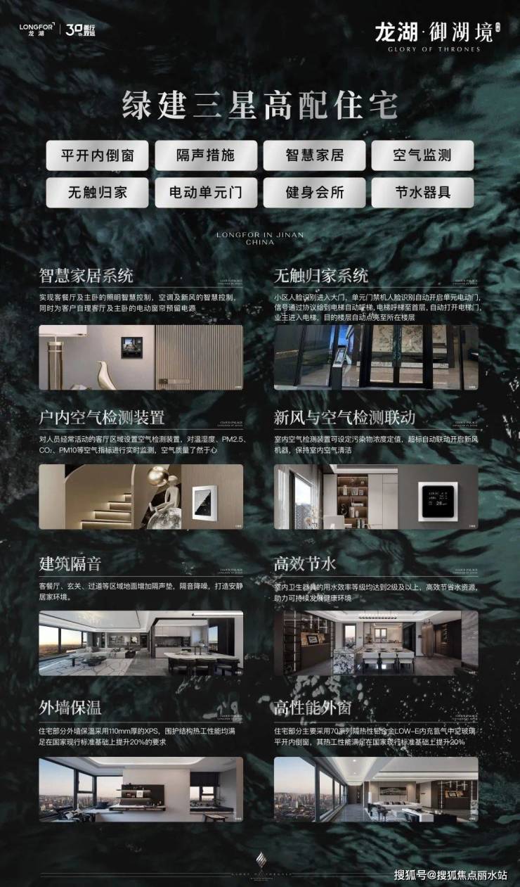 济南龙湖·御湖境具有高性能外窗、外墙保温、建筑隔音、无触归家、高效节水等8大系统的加持,是西城首个入市的绿建三星高定住宅、济南首个100%智能化社区。