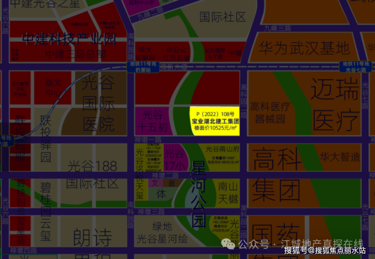 因此,在2022年12月16日的光谷土拍中,P(2022)108这宗绝版地块,经历了9次竞拍,竞得总价11.999亿元,溢价率约3.45%,楼面价约10525元/㎡,最终幸运的落到了实力强劲的宝业集团手中,瞬间引爆整个光谷地产圈!