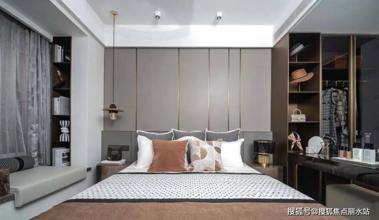 主卧从家具到墙面装饰,简洁利落的直线条随处可见,浓重不失雅致的色调营造出舒适惬意的空间氛围。开放式的衣帽间实现了空间的高效利用,让设计回归生活的本质。