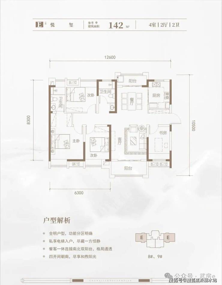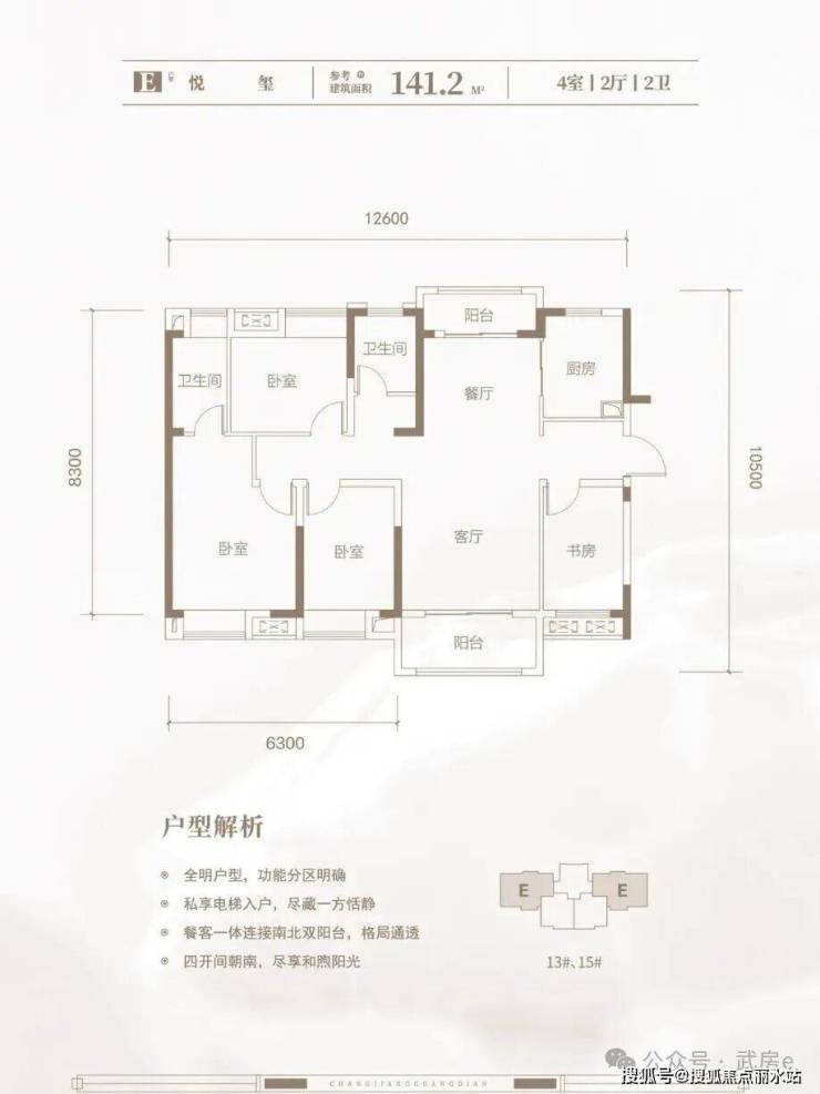 建面约141㎡、142㎡四房两厅两卫,户型方正,四开间朝南,12.6米大面宽设计,极致通风采光,南北双阳台,偏改善!