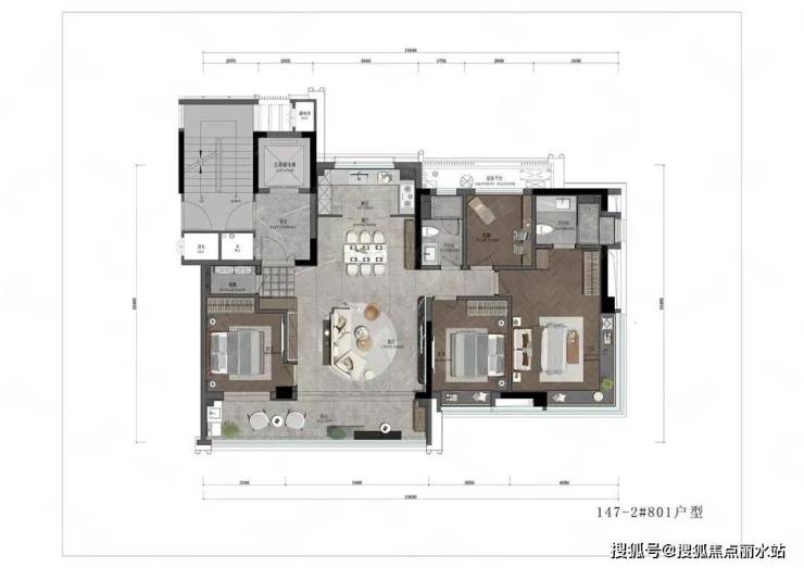 第二个是建面约147平方米的户型。四开间朝南、朝南面宽约15.7米、全屋强大的收纳功能。