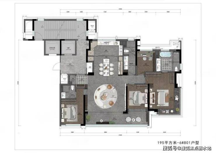 首先看下195平户型,该户型是4室2厅3卫1厨结构,双套房设计,南向面宽约17米,足以媲美市面上多数200+㎡的户型。